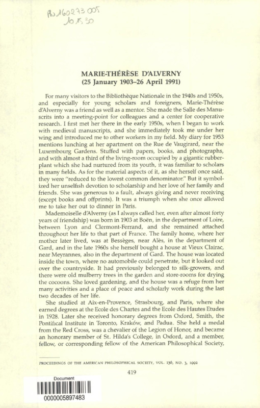 Biographical Memoirs : Marie-Thérèse d'Alverny