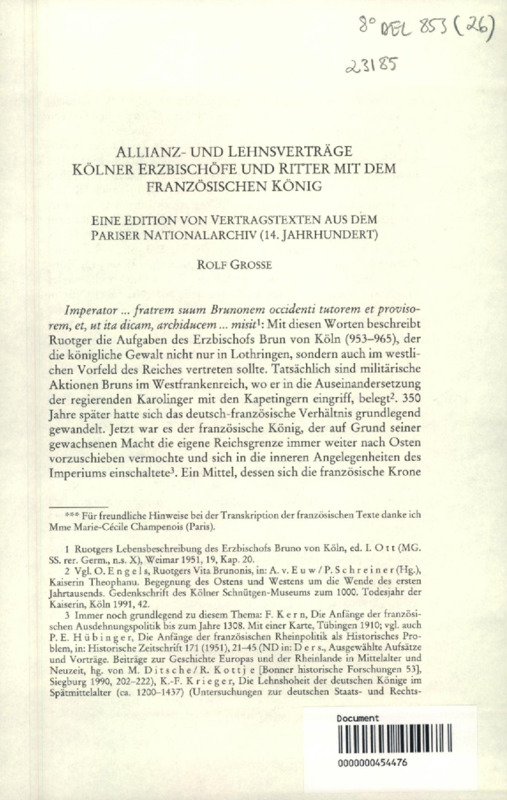 Allianz und Lehnsvertaräge Kölner Erzbischöfe und Ritter mit dem französischen König : eine Edition von Vertragstexten aus dem pariser Nationalarchiv (14. Jahrhundert)