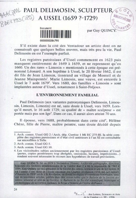 Paul Delimosin, sculpteur Aussel (1659? -1729).