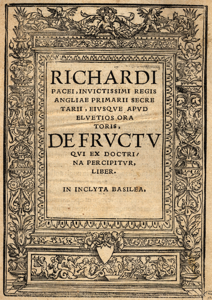 Frontispice pour Richardi Pacei, invictissimi regis Anglae primarii secretarii, ejusque apud Elvetios oratoris, De Fructu qui ex doctrina percipitur, liber.