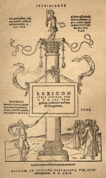 Frontispice pour Lexicon juris civilis per C.V.D.IAC. Spiegelium, postremo auctum et recognitum