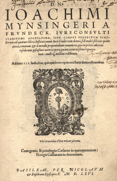 Marque au titre pour D.N. Joachimi Mynsingeri a Frundeck, jureconsulti clarissimi Apotelesma, sive Corpus perfectum scholiorum ad quatuor libros Institutionum Juris Civilis,...