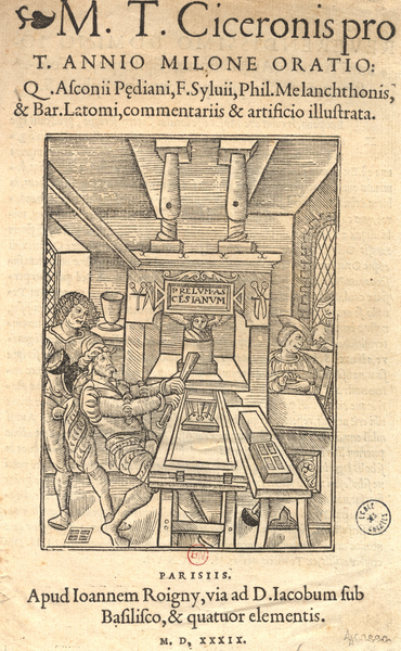 Frontispice pour M.T. Ciceronis pro T. Annio Milone oratio: Q. Ascanii Pediani, F. Sylvii, Phil. Melanchtonis, & Bar. Latomi, commentariis & artificio illustrata