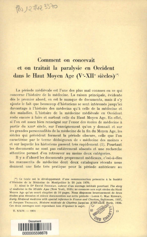 Comment on concevait et on traitait la paralysie en Occident dans le Haut Moyen Age, Ve-XIIe siècles