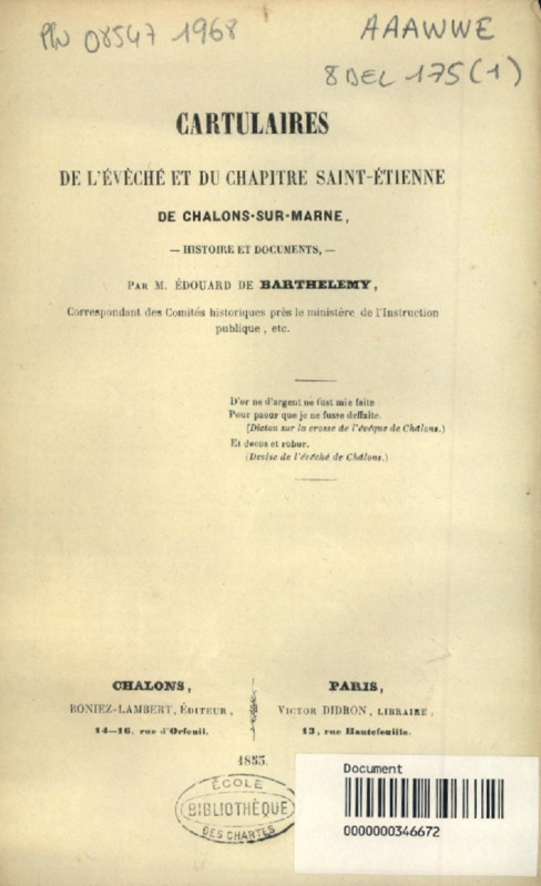 Cartulaires de l'Evêché et du Chapître Saint-Etienne de Châlons- sur-Marne : histoire et documents