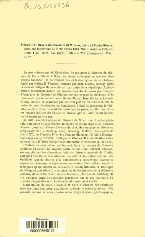 Felice Calvi. Storia del Castello di Milano, detto di Porta Giovia, dalla sua fondazione al dì 22 marzo 1848