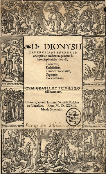 Frontispice pour D.Dionysii Carthusiani enarrationes piae ac eruditae in quinque libros Sapientale, hoc est, Proverbia, Ecclesiasten, Canticum canticorum, Sapientae, Ecclesiasticum