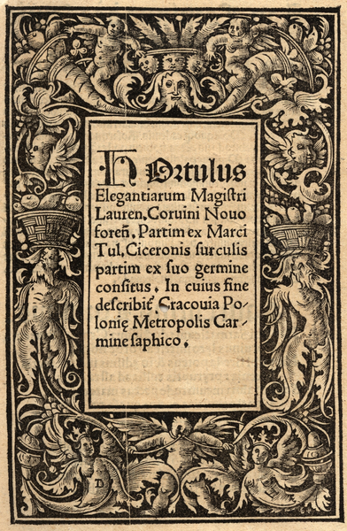 Frontispice pour Hortulus elegantiarum magistri Lauren. Corvini,... partim ex Marci Tulii Ciceronis surculis, partim ex suo germine consitus. In cujus fine describitur Cracovia, Poloniae metropolis, carmine saphico.