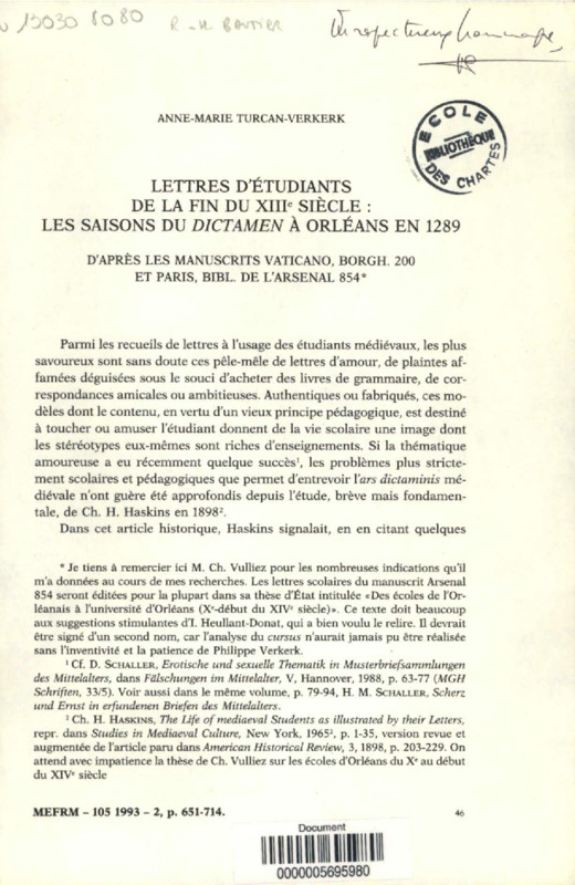 Lettres d'étudiants de la fin du XIIIe siècle : les saisons du dictamen à Orléans en 1289 d'après les manuscrits Vaticano, Borgh. 200 et Paris, Bibl. de l'Arsenal 854