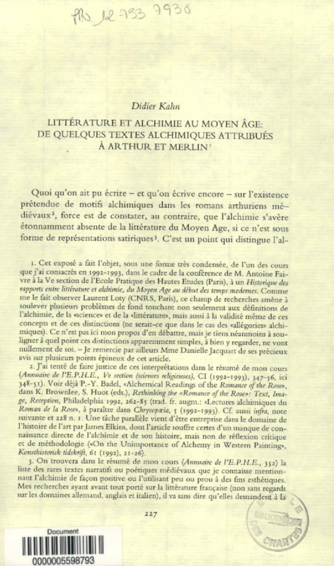 Littérature et alchimie au Moyen âge : de quelques textes alchimiques attribués à Arthur et Merlin