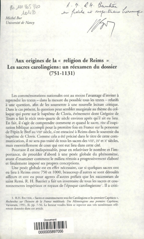 Aux origines de la "religion de Reims" : les sacres carolingiens : un rééxamen du dossier, 751-1131