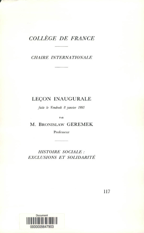 Leçon inaugurale faite le vendredi 8 janvier 1993, Collège de France, Chaire internationale : histoire sociale : exclusions et solidarité