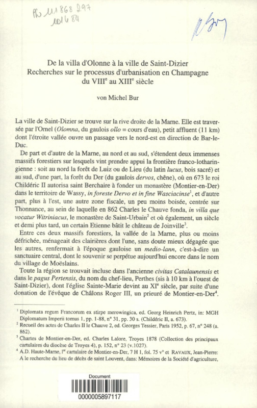 De la villa d'Olonne à la ville de Saint-Dizier : recherches sur le processus d'urbanisation en Champagne du VIIIe au XIIIe siècle