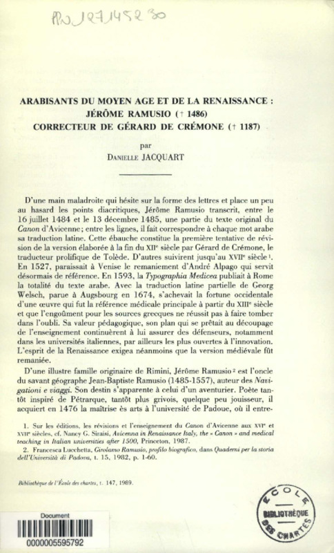 Arabisants du Moyen âge et de la Renaissance : Jérôme Ramusio, correcteur de Gérard de Crémone