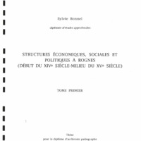 Structures économiques, sociales et politiques à Rognes (début du XIVe siècle – milieu du XVe siècle) Structures économiques, sociales et politiques à Rognes (début du XIVe siècle – milieu du XVe siècle) position de thèse Auteur Bonnel, Sylvie Date de soutenance 1998 Mots-clés Vie rurale Démographie Seigneuries Autre version Consulter le texte sur le site des positions de thèses Thèse Structures économiques, sociales et politiques à Rognes (début du XIVe siècle – milieu du XVe siècle)