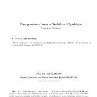 Être professeur sous la Troisième République. Les enseignants du lycée de Rennes entre 1870 et 1914. Étude prosopographique position de thèse Auteur Le Guennec, Manon Date de soutenance 2016 Mots-clés Enseignement secondaire Professeurs (enseignement secondaire) Autre version Consulter le texte sur le site des positions de thèses Thèse Être professeur sous la Troisième République. Les enseignants du lycée de Rennes entre 1870 et 1914. Étude prosopographique