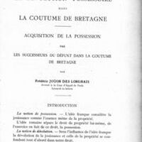 La dévolution possessoire dans la coutume de Bretagne. Acquisition de la possession par les successeurs du défunt dans la coutume de Bretagne
